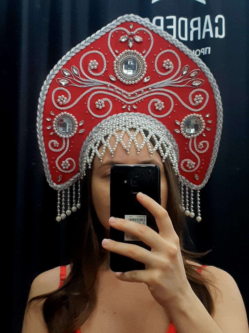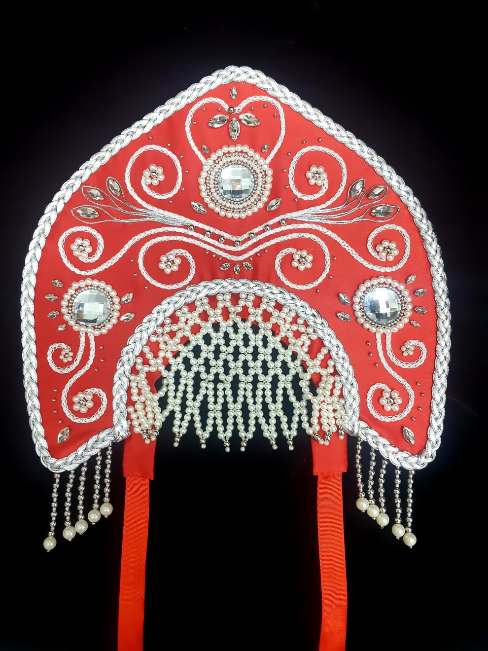 Кокошник красный с жемчужной шапочкой
